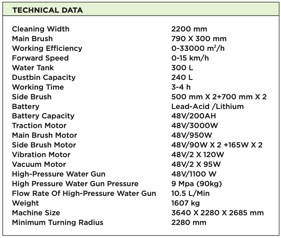 The Ross Street 2000E is an electric road sweeper featuring a dedicated chassis, integrated structure, & combined sweeping suction system. With a sleek design & flexible operation, it efficiently cleans debris such as gravel, cans, fallen leaves, & more. It is an ideal choice for sweeping large areas like streets, residential communities, schools, & more.